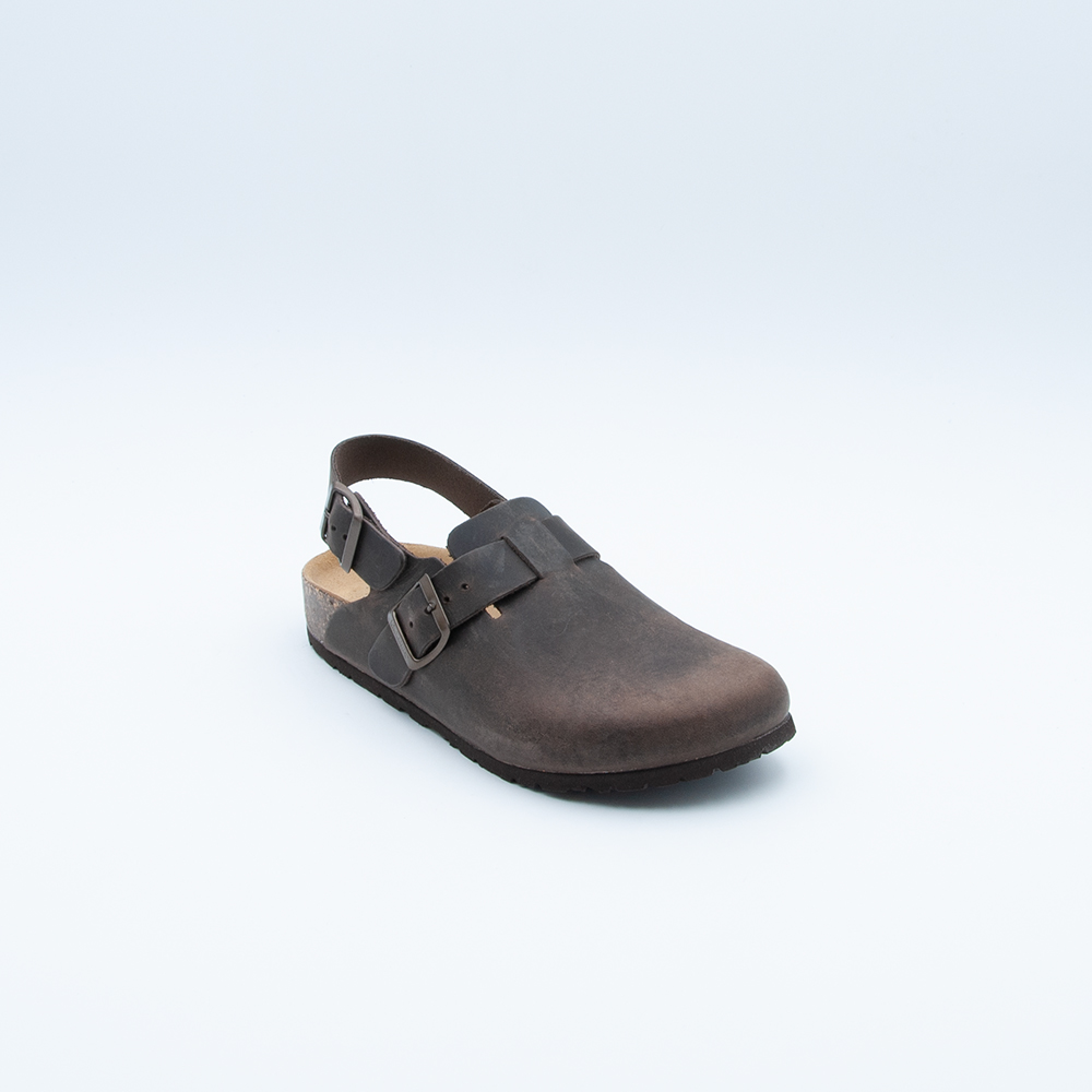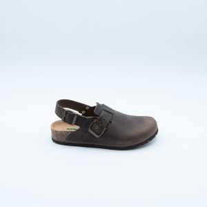Sabot BioNatura chiuso con cinturino sul retro, realizzato in pelle ingrassata color testa di moro. Si contraddistingue per il sottopiede in memory e fondo in gomma Vibram.