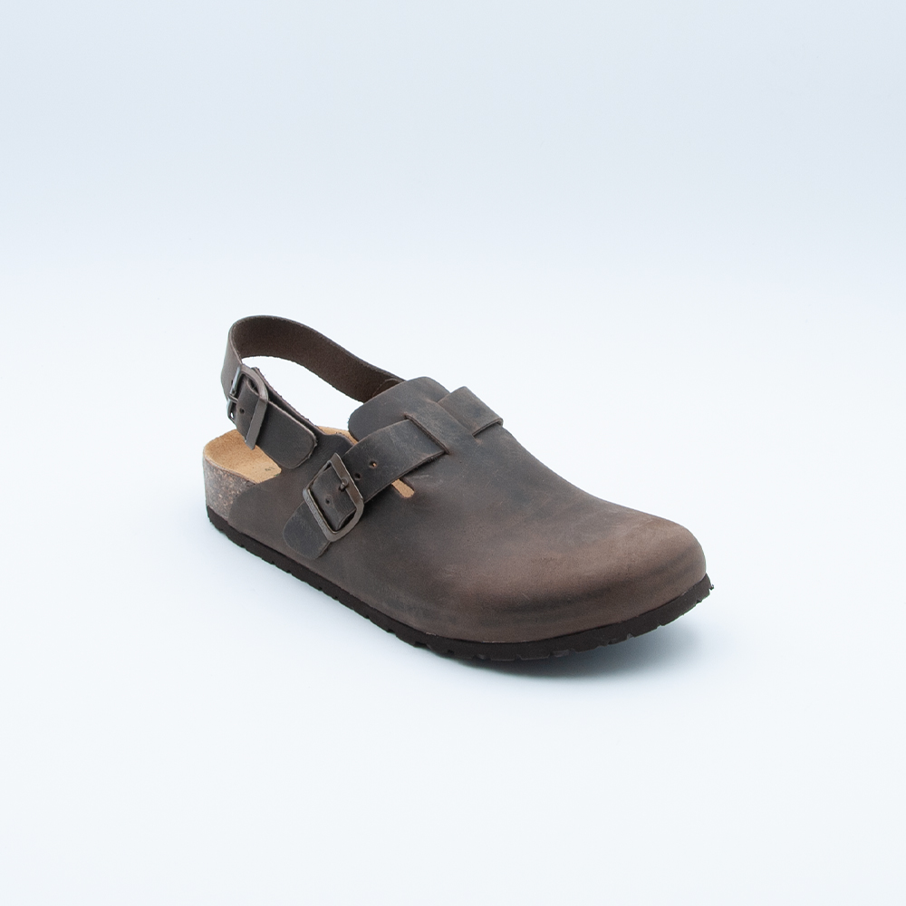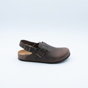 Sabot BioNatura chiuso con cinturino sul retro, realizzato in pelle ingrassata color testa di moro. Si contraddistingue per il sottopiede in memory e fondo in gomma Vibram.
