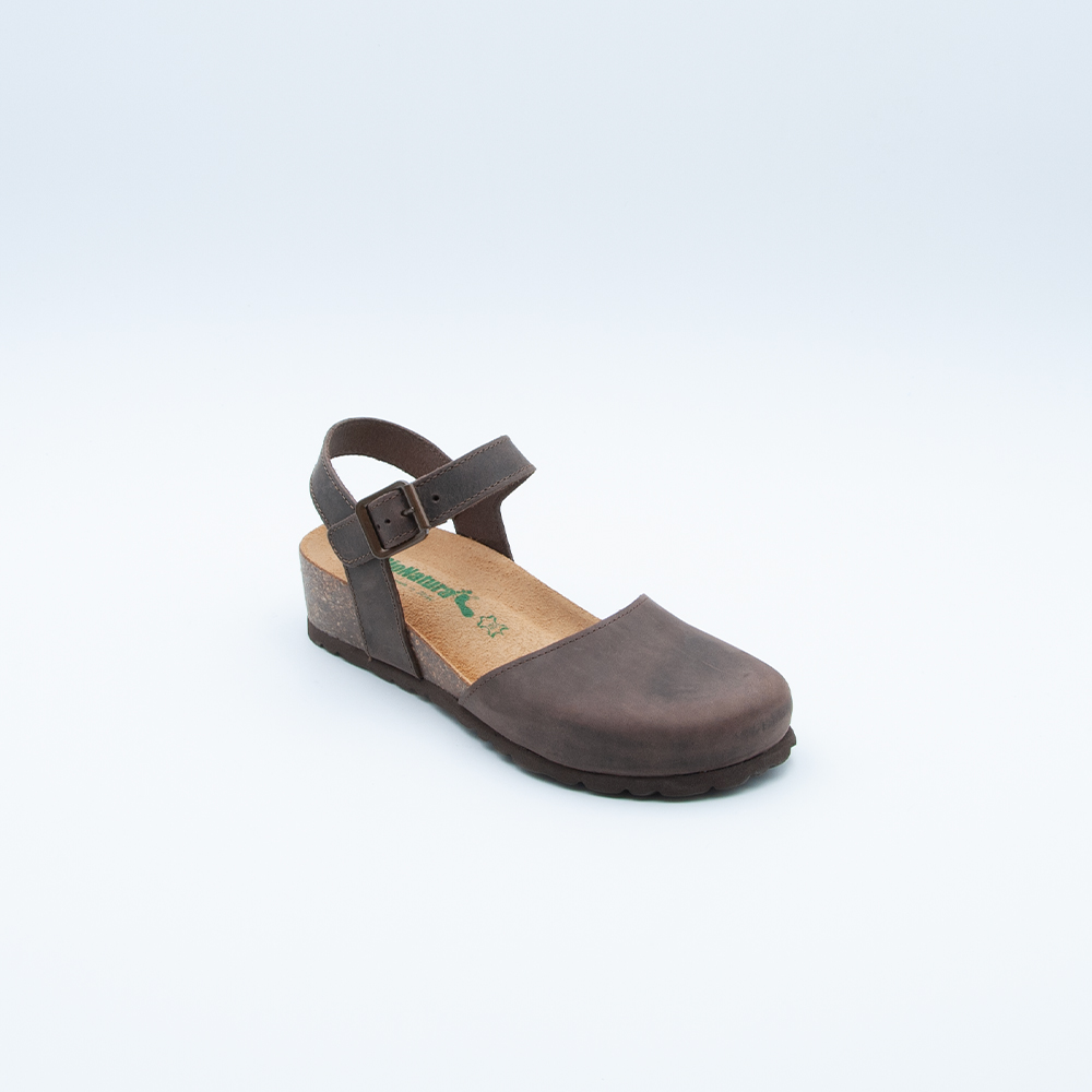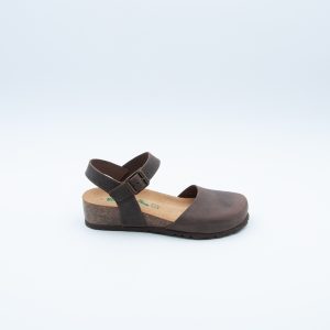 Sandalo BioNatura chiuso in punta con cinturino alla caviglia, realizzato in pelle ingrassata color testa di moro. Si contraddistingue per il sottopiede in memory e il tacco alto 4 cm.