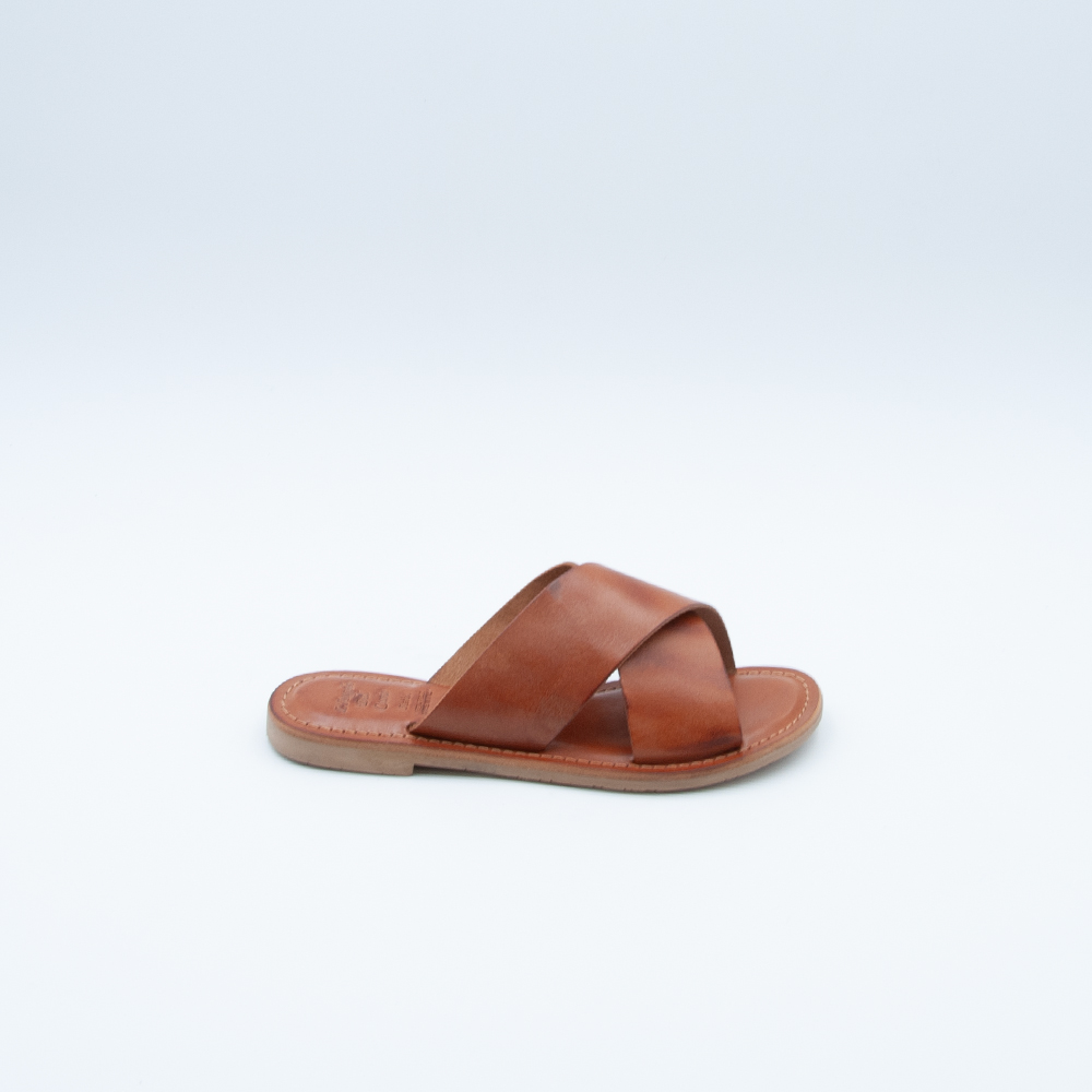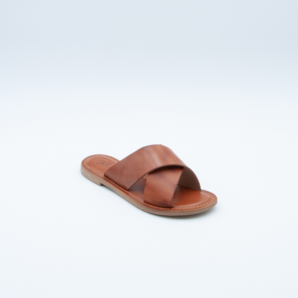 Ciabatta incrociata realizzata in vacchetta color cuoio con fondo in gomma antiscivolo. Si contraddistingue per il sottopiede imbottito.
