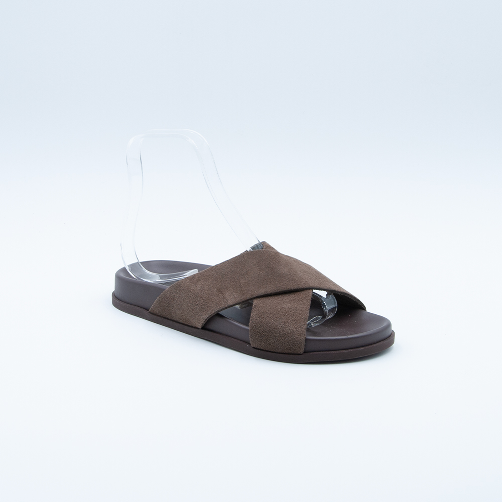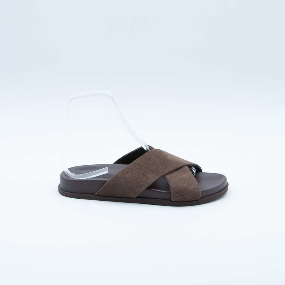 Ciabatta da uomo con fasce incrociate, realizzata in camoscio color pepe, con plantare anatomico e fondo in gomma antiscivolo.