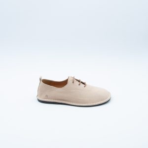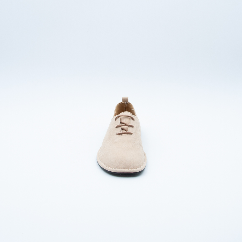 Scarpa dal design minimal con lacci realizzata in nabuk color crema, con soletta interna in pelle e fondo in gomma antiscivolo. Si contraddsitingue per la forma ampia e la morbidezza del materiale che accompagnano la forma naturale del piede.