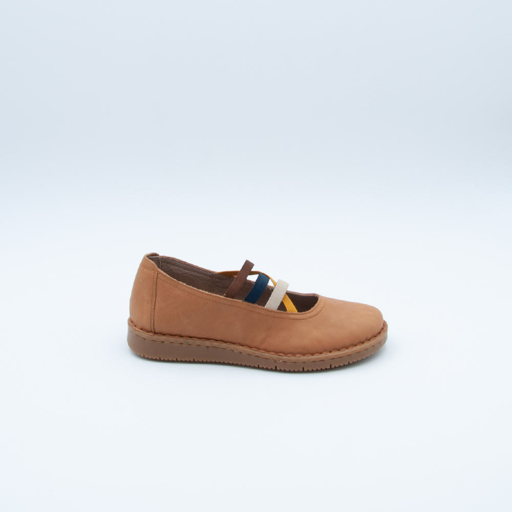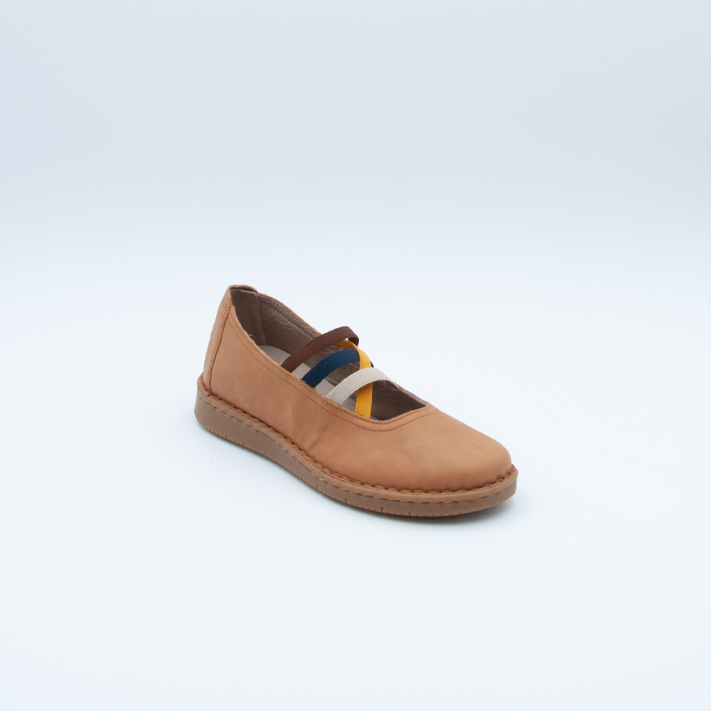 Grünland – Ballerina con dettaglio elastici, realizzata interamente in pelle di colore cuoio foderata, con sottopiede morbido e fondo in gomma antiscivolo. Plantare estraibile. Made In Italy.