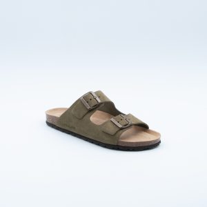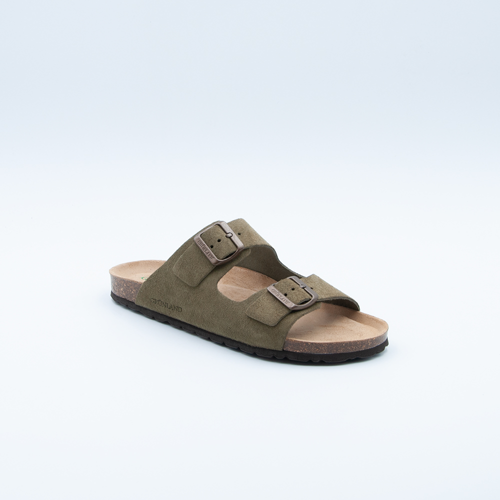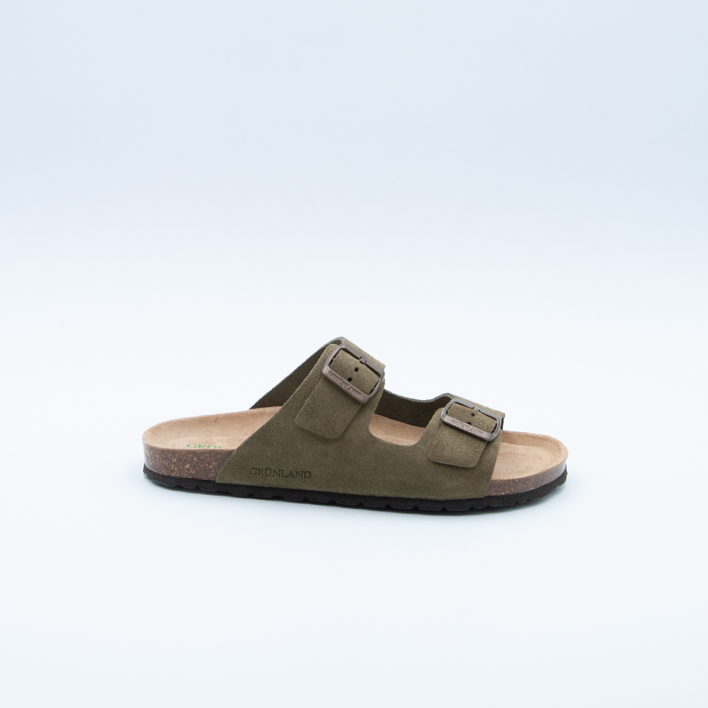 Grünland – Ciabatta a doppia fascia, realizzata in camoscio color oliva con plantare in sughero naturale e sottopiede memory.