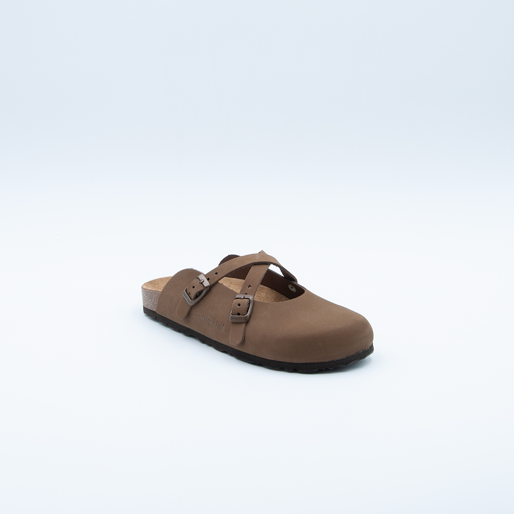 Grünland – Sabot con dettaglio dei cinturini ad incrocio, realizzato in in nabuk di colore marrone con plantare in sughero naturale e sottopiede memory.