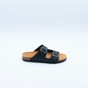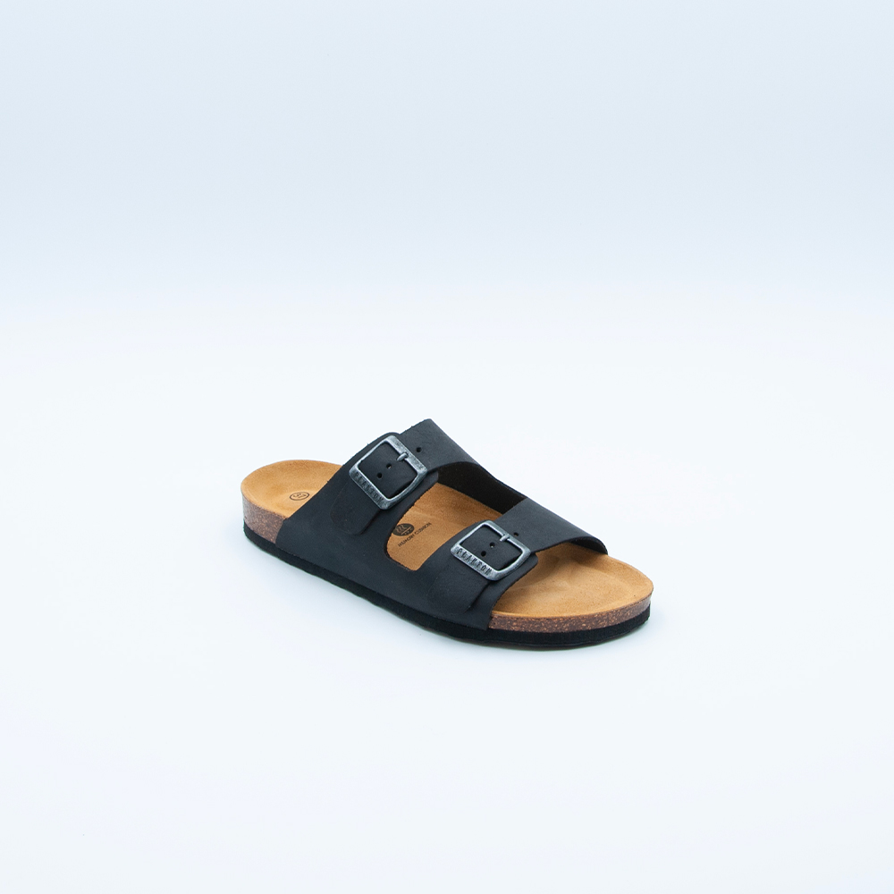 Ciabatta Plakton a due fibbie, realizzata in pelle ingrassata di colore nero con plantare in sughero naturale e sottopiede memory.
