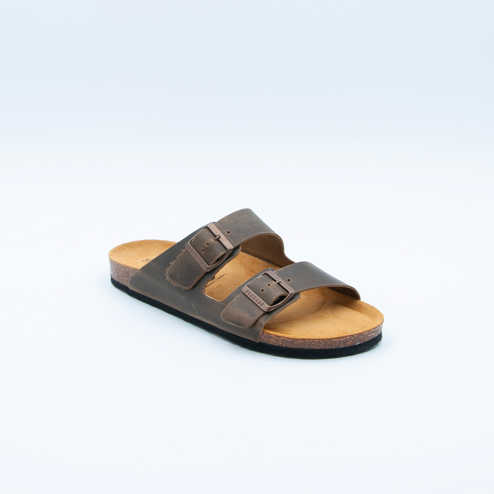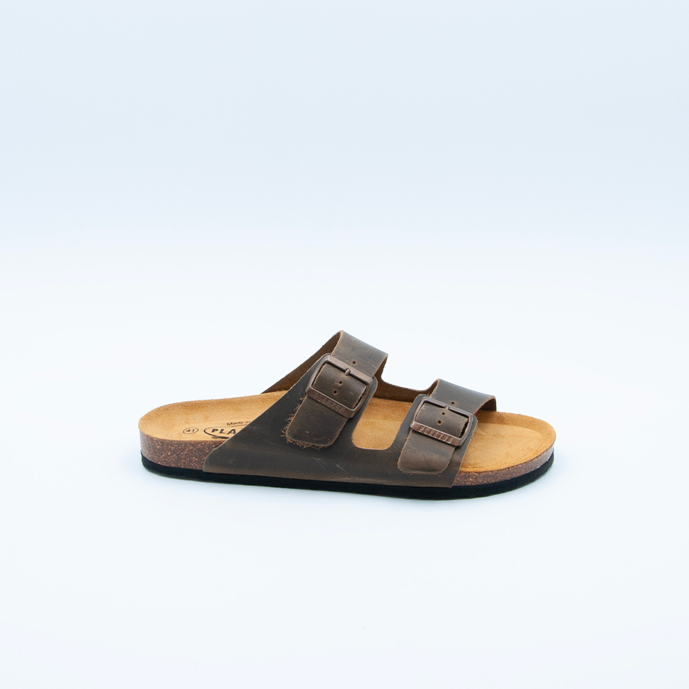 Ciabatta Plakton da uomo a due fibbie, realizzata in pelle ingrassata color oliva con plantare in sughero naturale e sottopiede memory.