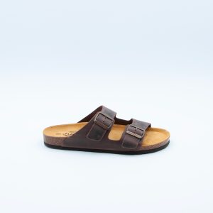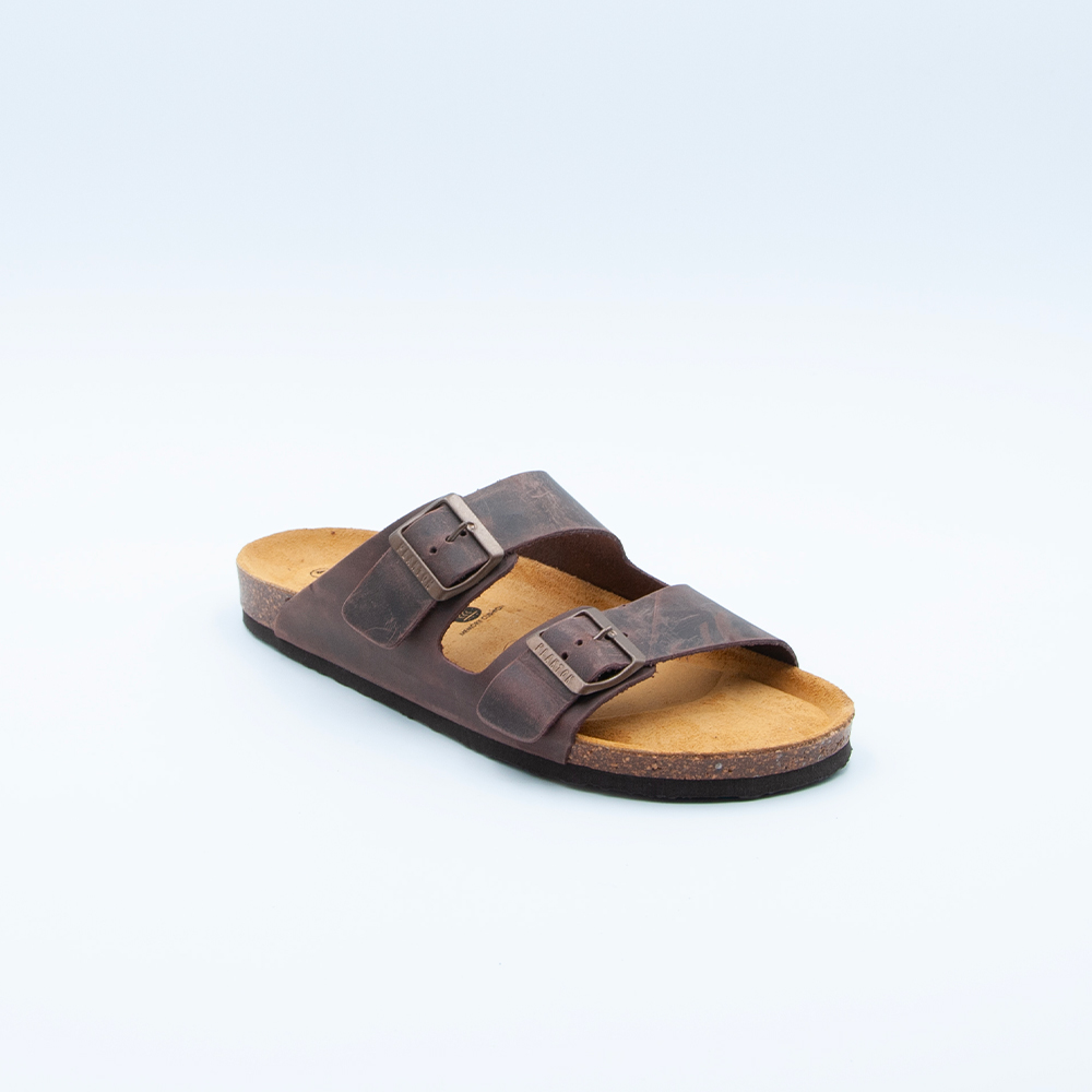 Ciabatta Plakton da uomo a due fibbie, realizzata in pelle ingrassata testa di moro cuoio con plantare in sughero naturale e sottopiede memory.