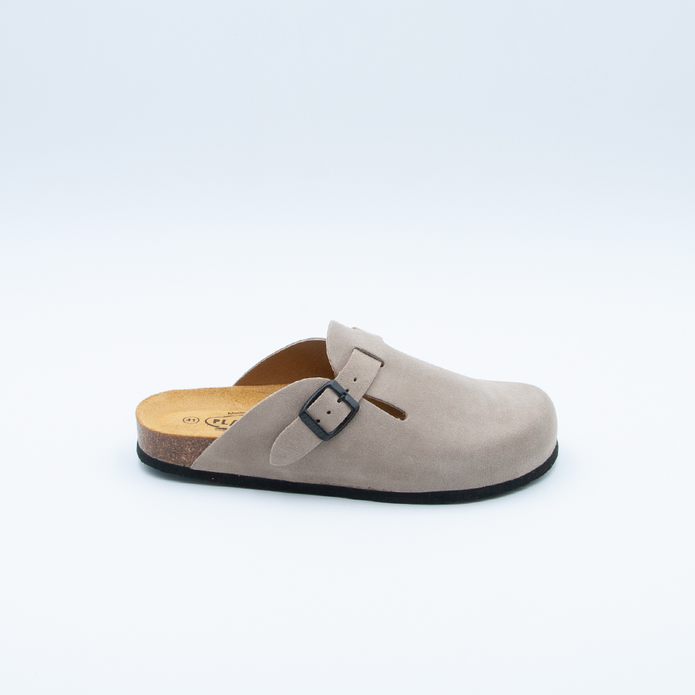 Sabot Plakton uomo realizzato in pelle scamosciata color grigio pietra con plantare in sughero naturale e sottopiede memory.