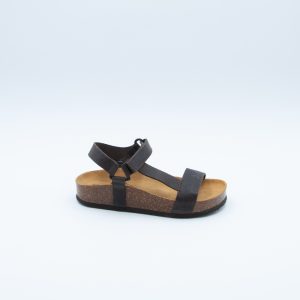 Sandalo Plakton in pelle color testa di moro, caratterizzato dalla chiusura a strappo sulla caviglia, con plantare in sughero naturale e sottopiede memory. Si contraddistingue per la suola più alta.