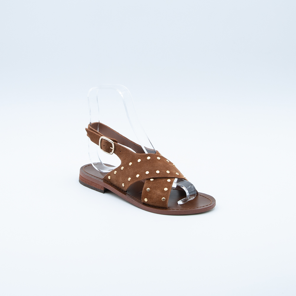 Sandalo composto da due fasce larghe incrociate arricchite con borchiette dorate ed allacciatura sul retro, realizzato in camoscio color cuoio, con fondo in cuoio e tacco in gomma antiscivolo.