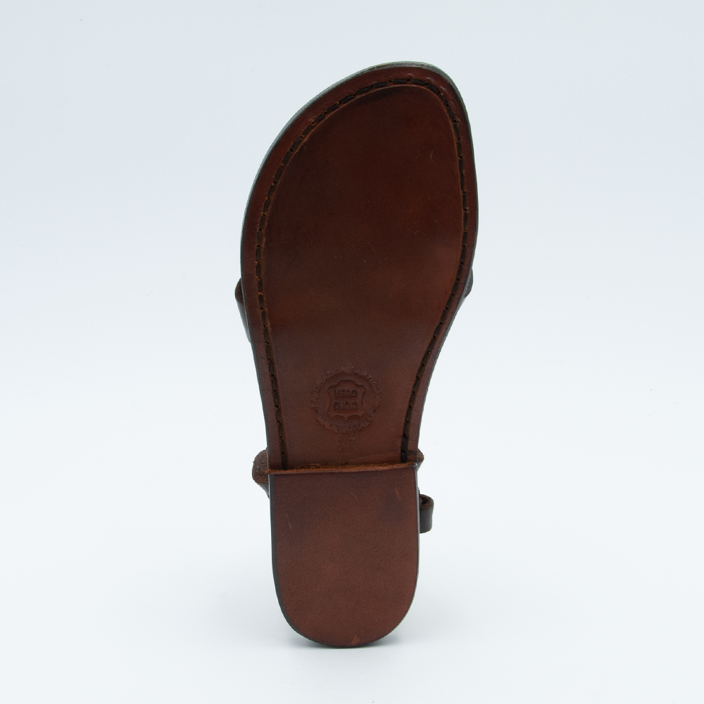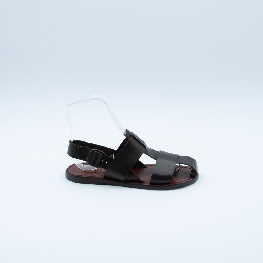 Sandalo gabbia caratterizzato da tre larghe fasce che che si intersecano, realizzato in vacchetta trattata al naturale color testa di moro e fondo in cuoio cucito.