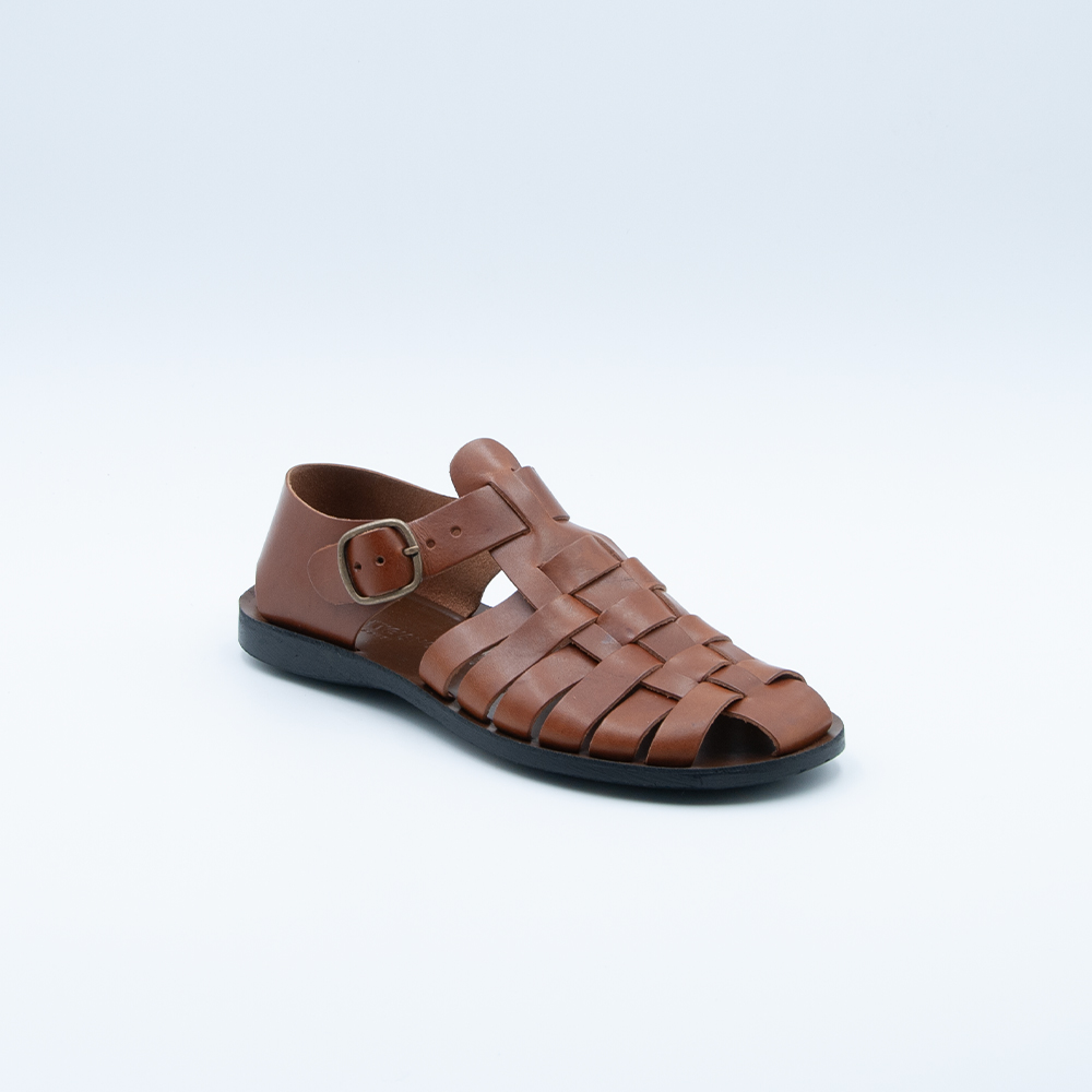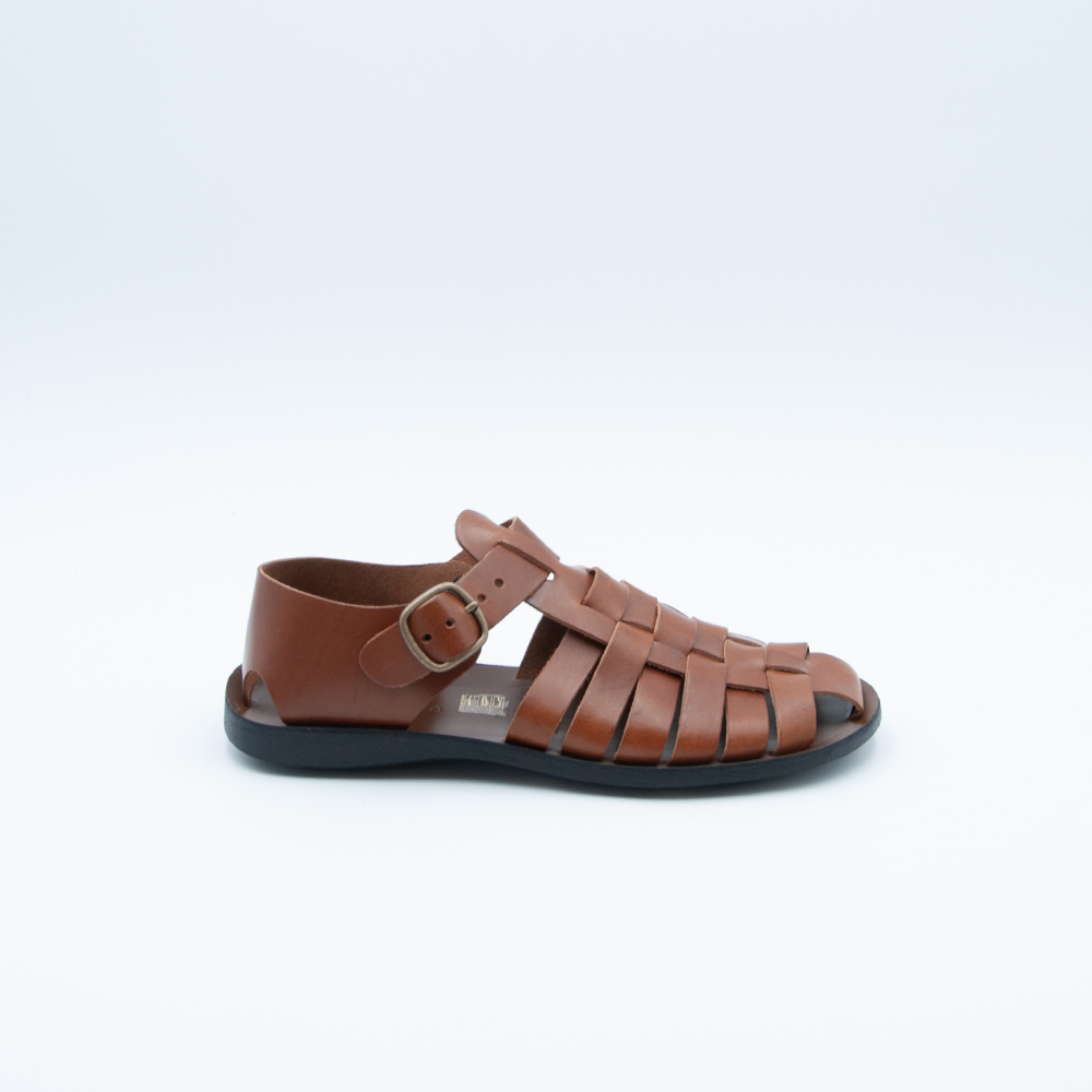 Sandalo a gabbietta chiuso dietro, realizzato in vacchetta color cuoio con fondo in gomma antiscivolo.