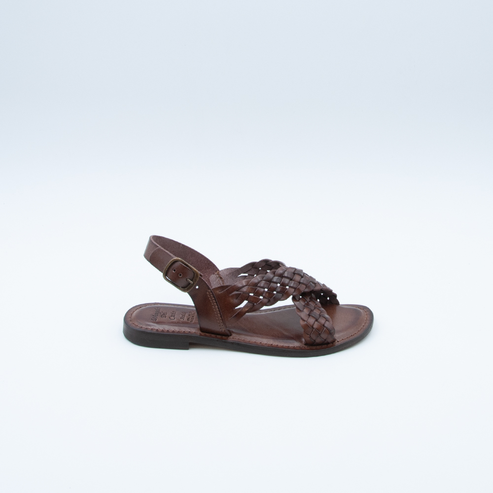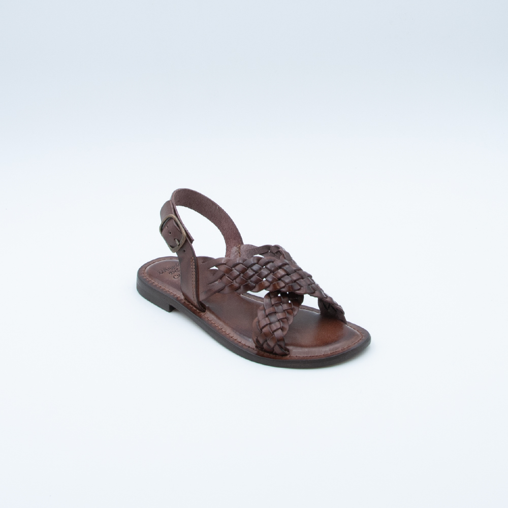 Sandalo caratterizzato da due trecce che si incrociano, realizzato in vacchetta color marrone con fondo in cuoio e tacco in gomma antiscivolo. Si contraddistingue per il sottopiede imbottito.