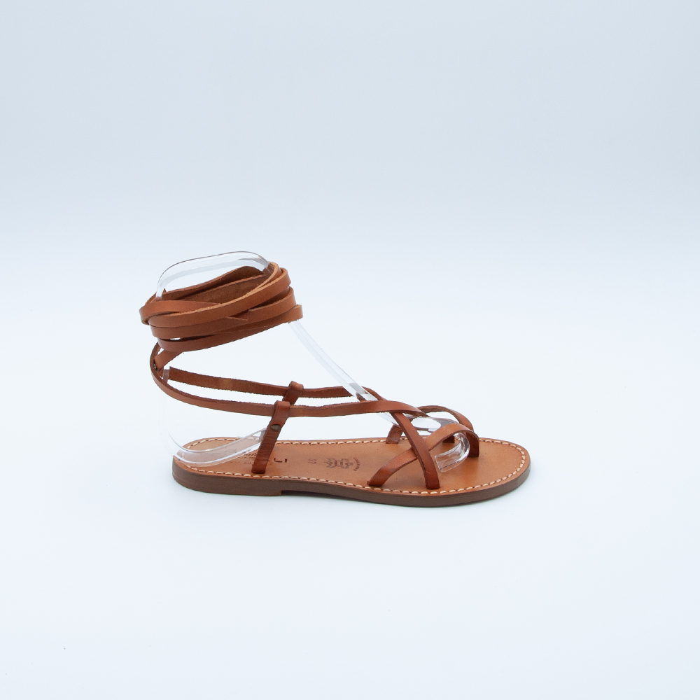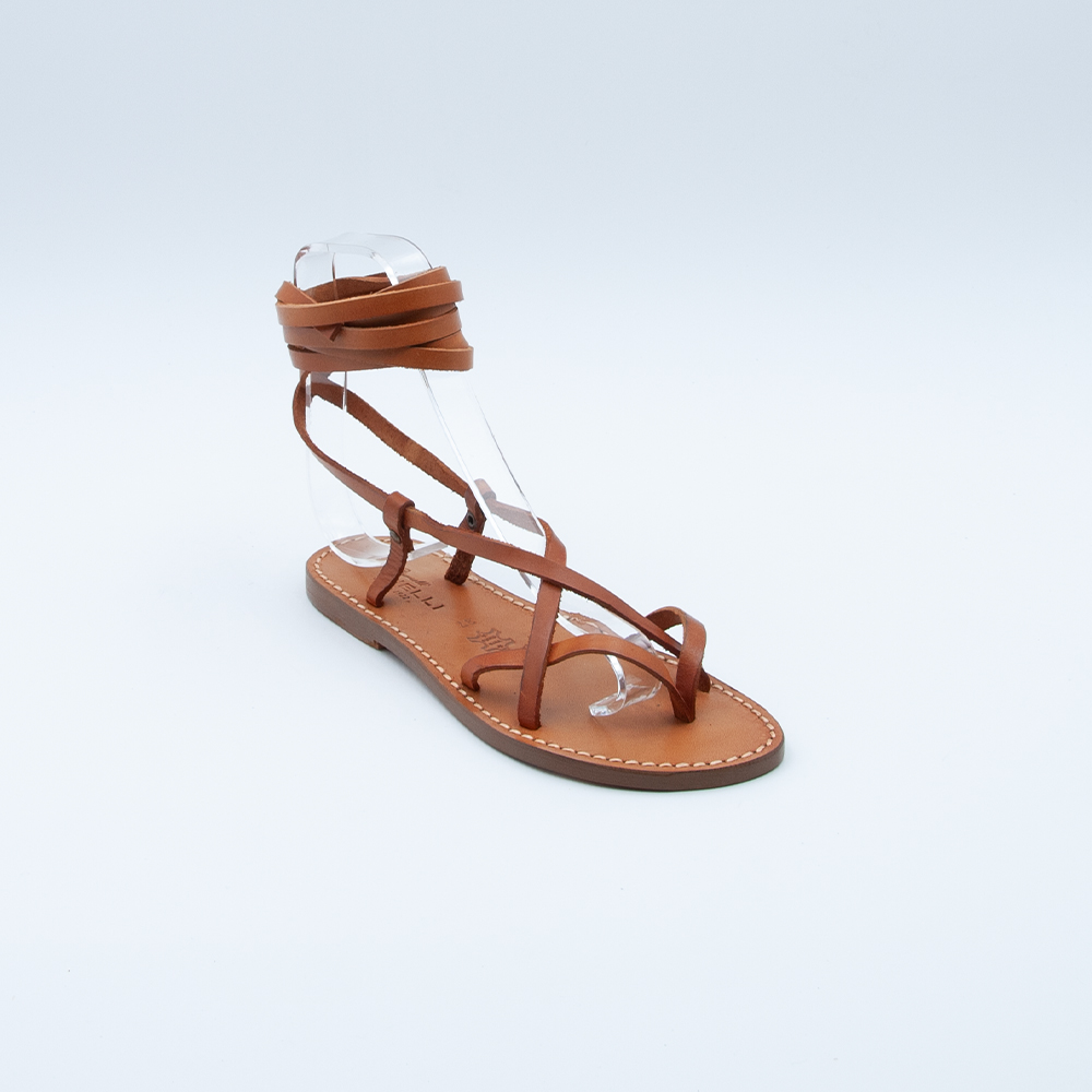 Sandalo infradito con lacci alla schiava, realizzato in vacchetta trattata al naturale color cuoio, con fondo in cuoio cucito.