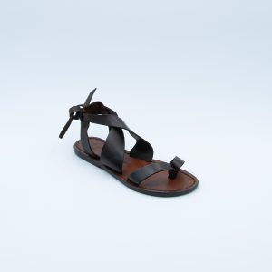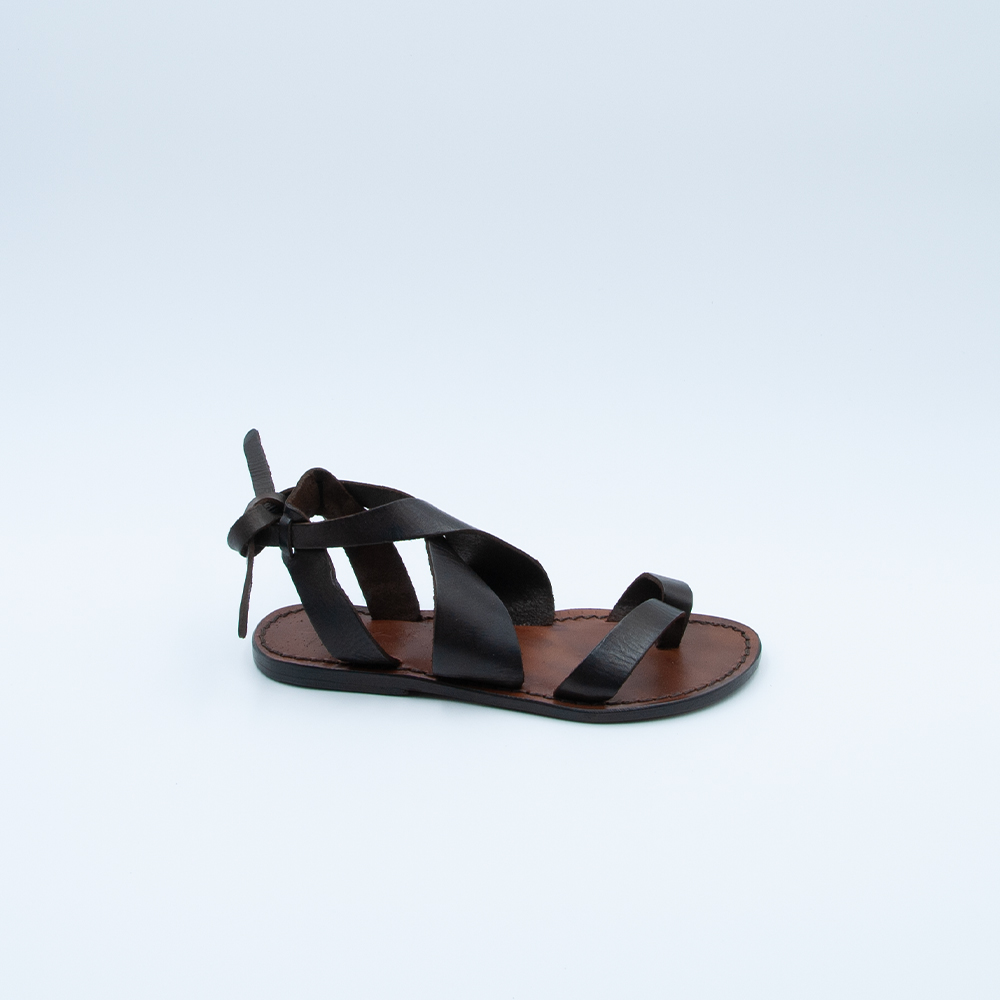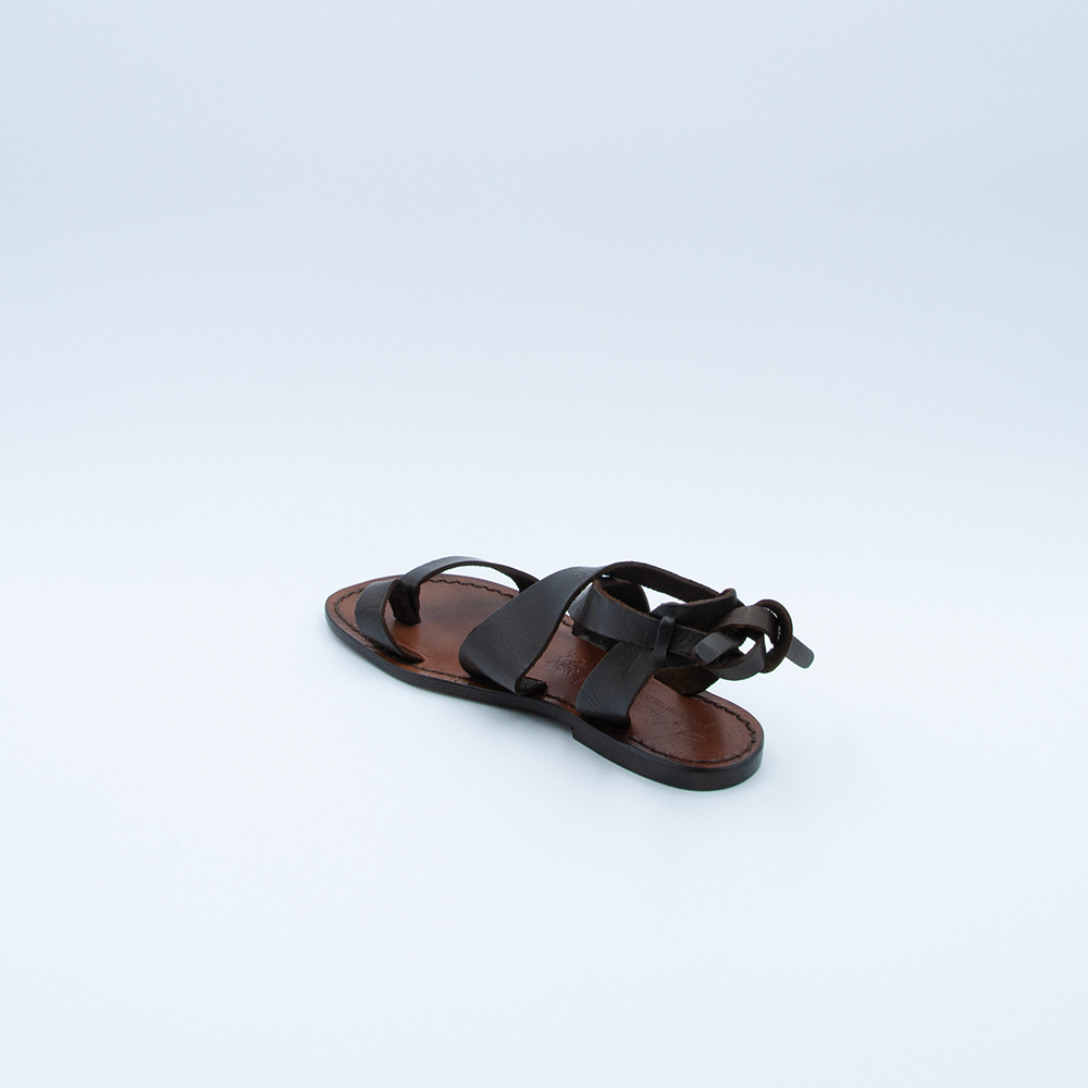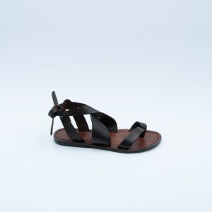 Sandalo infradito caratterizzato dalle larghe fasce incrociate sul collo del piede e l’allacciatura a nodo, realizzato in vacchetta trattata al naturale color testa di moro con fondo in cuoio cucito.