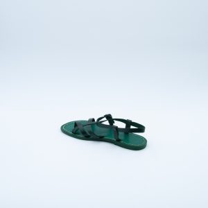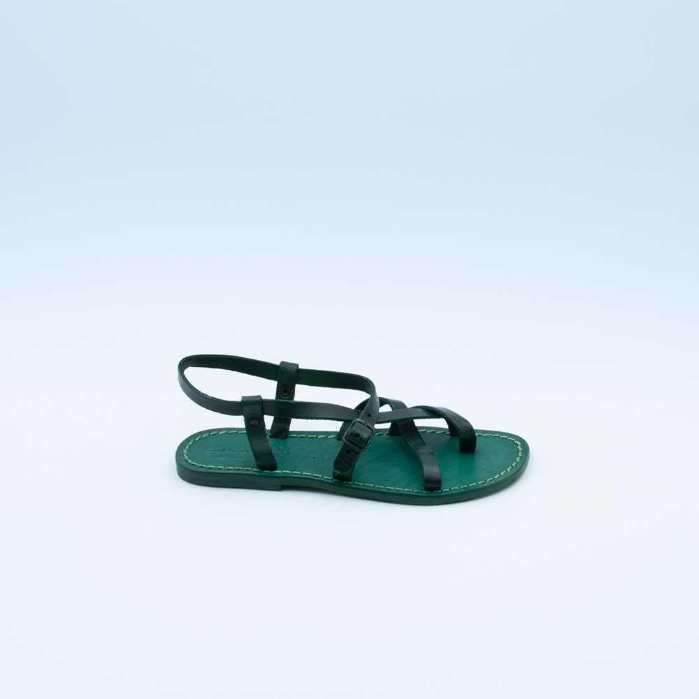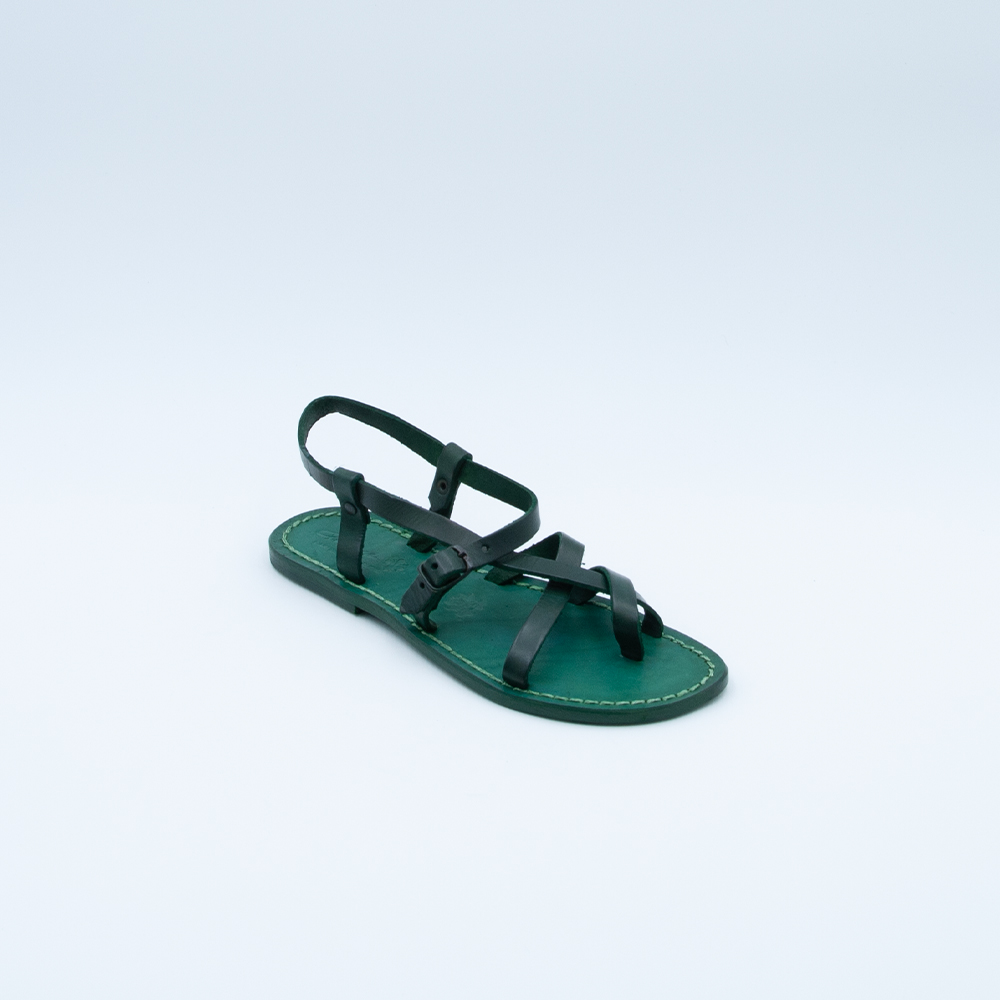 Sandalo infradito caratterizzato da un intreccio di fasce strette, realizzato in vacchetta trattata al naturale di colore verde con fondo in cuoio cucito.