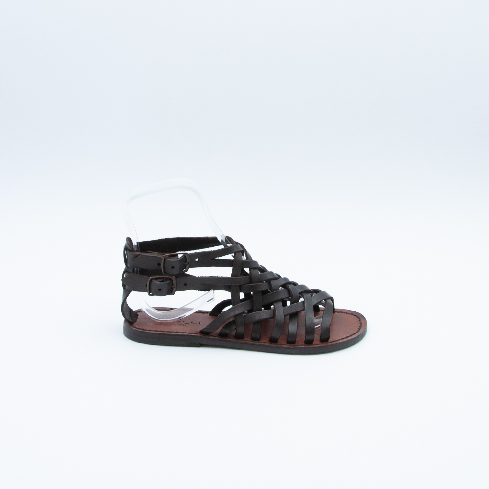 Sandalo caratterizzato dalle numerose fascette intrecciate e dal doppio cinturino all’altezza della caviglia, realizzato in vacchetta trattata al vegetale color testa di moro e fondo in cuoio cucito.