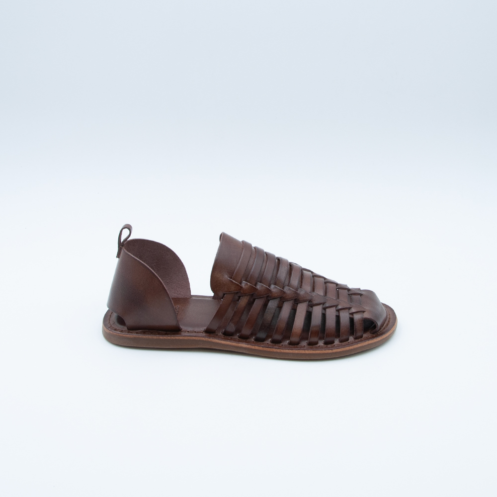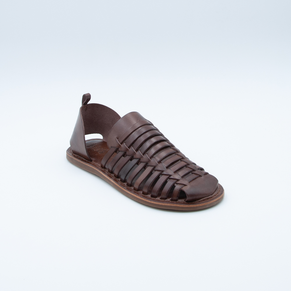Calzatura a metà tra sandalo e mocassino, realizzata in vacchetta color marrone con fondo in gomma antiscivolo. Si contraddistingue per il sottopiede imbottito.