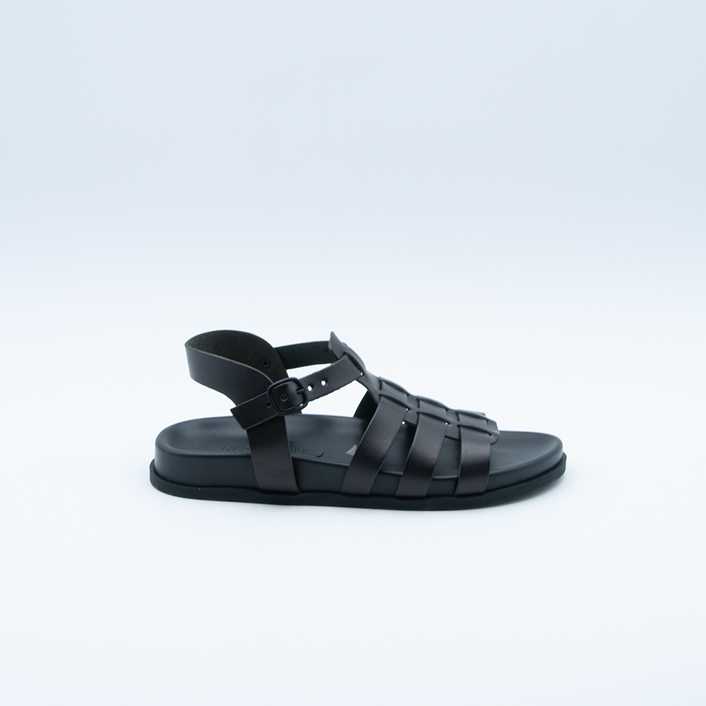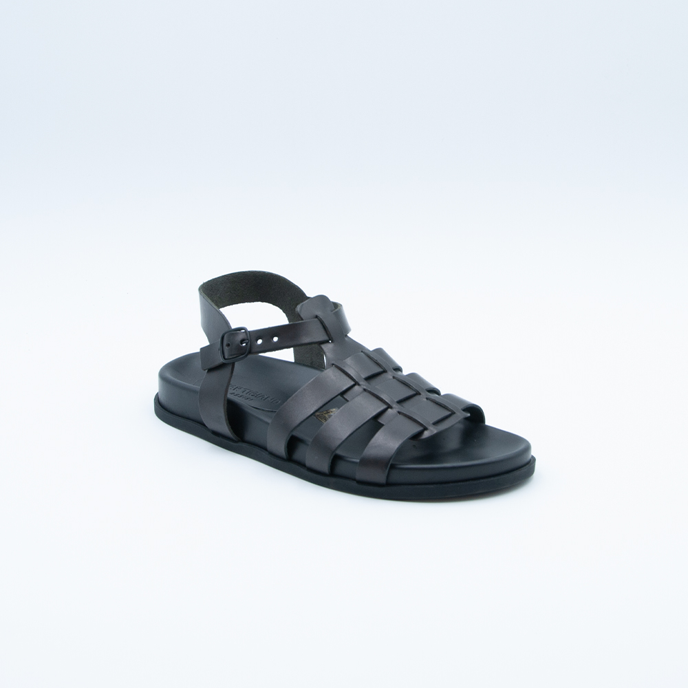 Sandalo da uomo intrecciato con cinturino alla caviglia realizzato in vacchetta di colore nero, con plantare anatomico e fondo in gomma antiscivolo.
